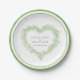 Mistletoe heart wreath drawing green and white winter wedding paper plate. Add your own couples' name and wedding date in fresh green on crisp white. Other colours and matching wedding items are available. © Original drawing and design by Sarah Trett for www.mylittleedenweddings.com on Zazzle.
