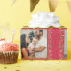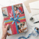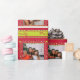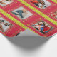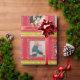 Fun holiday photos framed in mistletoe and partridges. Christmas family photos striped wrapping gift paper in shades of red and lime green, with hints of yellow and white. Customise with five of your own special family or kids photos. and your own message, currently reads Merry Christmas from the Jackson Family. Uniquely designed by Sarah Trett.