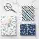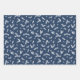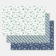 Blue, green, and white Christmas wrapping paper sheets with patterns in matching colours: one with green mistletoe twigs. One with preppy blue, green, and white stripes. And one in navy blue with white mistletoe twigs.