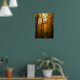 The morning sun peaks through the foggy woods in this colourful fall scene.