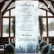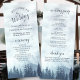 This beautiful wedding program features a rustic yet elegant design with a watercolor landscape of mountains covered in blue spruce or pine trees shrouded in mist or fog. The titles are written in fancy script calligraphy, and there is space for your ceremony and wedding party details, as well as a short thank you for your guests. Wonderful way to welcome your friends and family to your wedding celebration.