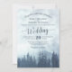 This beautiful wedding invitation features a rustic yet elegant style with lacy script calligraphy on a watercolor background of blue mountain spruce or pine trees shrouded in mist or fog. The colours are a variety of shades of blue, making this invitation perfect for an outdoor, wilderness, or winter ceremony. The back has space for a QR Code and web address where your guests can get more information and RSVP.