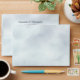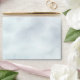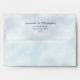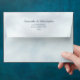 These wedding envelopes feature a rustic design with a marbled pale blue outside, a pre-printed return address on the back flap, and an alpine mountain scene inside the back flap of a mountainside covered with pine trees shrouded in mist or fog. Perfect for an outdoor or mountain themed wedding.