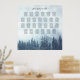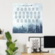 This beautiful 26 table wedding seating chart has table assignments for 260 guests at the traditional seating arrangement of 10 people per table. The rustic yet elegant design features a misty woodland forest of blue spruce or pine trees in. The title reads "please find your table" in elegant lacy script calligraphy. There is space for the couple's names and wedding date. Perfect for an outdoor or mountain destination wedding.