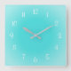 An aqua blue wall clock in soft colours, tropical breeze pastel aquamarine tones with white numbers and misty fading colour or frosted edge look design, simple and elegant. Aqua is a blue-green colour of mental refreshment, imagination, self-awareness, tropical lagoons and clear mountain streams, also a traditional soft blue colour for a boy's room. This whimsical design is sure to please. In square (shown) or round shapes. A great gift for friends and family for special occasion, birthday, Christmas, housewarming, bridal or baby shower, or any time you like. Original design Sylvia Rose. Please visit me on Twitter @Sylvia_FineArt. Have a great day!