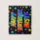 This exciting, fun, birthday-themed jigsaw puzzle design features the message "HAPPY BIRTHDAY, MISTY" with the characters having a colourful rainbow spectrum inspired gradient pattern, in addition to a lively star field background pattern. A vibrant puzzle like this might be used to send a birthday greeting message to somebody named Misty. [~Z0000468]