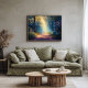 This painting portrays a mystical forest trail bathed in the soft glow of dawn. Sunlight filters through the dense canopy, casting golden beams onto the path, which is surrounded by lush foliage in shades of green, yellow, and purple. A light mist lingers in the air, adding a dreamy, ethereal quality to the scene. The interplay of light and shadow creates a sense of wonder and tranquillity, inviting the viewer to step into this enchanted woodland retreat.