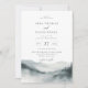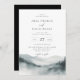 Elegant Watercolor Misty Mountain Pine Tree Forest Scene, wedding invitation. Invitation features chic typography design style mix of calligraphy and bold type. Coordinating solid black colour backing.