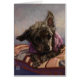 Misty the adorable little poodle mix painted by Traci Van Wagoner laying a striking tan and red pillow with one ear perched high on her head.