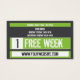 Mixed Martial Art Business Card Free Week Card business card with a green and dark grey colour scheme, modern design scheme, and strong typography elements. Back of card has free week placeholder. Space to add your classes, gym hours, or any other pertinent information. Perfect way to encourage class participation and an easy marketing tool. Perfect for a mixed martial arts gym, boxing gym, kickboxing gym, krav maga, or martial arts studio.