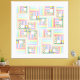 A geometric pattern composed of multicolored stripes and chequerboard squares is set against a solid brown background. The design features a repetitive, interlocking arrangement of squares and rectangles.