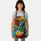 A.I. created print of a vibrant vase of colorful pansies sits against a dynamic, abstract background with swirling patterns and a mosaic-like foreground.