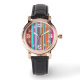 This women's watch has a simple design of vertical stripes of varying thicknesses in red, orange, purple, black, light blue, and white.