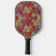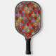 This pickleball paddle has an art deco design of tulips from pentagons and trapezoids in orange, red, purple, gold, and green.