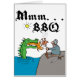 A mediaeval knight sitting on a shore while a fire breathing sea dragon roasts his chicken and caption Mmmm . . . BBQ available on barbeque t-shirts, barbeque buttons, barbeque aprons and more bbq gifts.