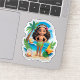 Sail into celebration with “Moana’s Island Birthday Vibes!” This tropical birthday sticker features Moana, Pua, and Maui surrounded by palm leaves, flowers, and island decorations, with a cheerful seashell banner that reads “Let’s Celebrate!” Perfect for adventurous spirits and ocean-loving birthday stars.