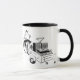 Mobile DJ cartoon on a mug. Gift idea for a Mobile DJ or anyone working as a mobile disc jockey. Funny image of DJ on a bicycle towing a trailer with his gear.
