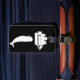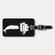Moby Dick Rising luggage tag. A minimalist vector design featuring a silhouette of a sperm whale charging a whaling ship. The design is based off the specs for the whale ship Essex, the sinking of which inspired Herman Melville to write Moby Dick. A sharp design for anyone who loves Moby Dick, Herman Melville, and American literature.