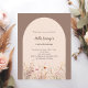 An elegant wildflower invitation. A Mocha, muted brown background and a beige coloured arch. Decorated with watercolored wildflowers in beige, pink.