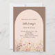 An elegant wildflower invitation. A Mocha, muted brown background and a beige coloured arch. Decorated with watercolored wildflowers in beige, pink.
