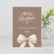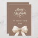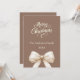 A mocha, muted brown background, cream coloured text and bow. Merry Christmas is written with an elegant hand-lettered style script. Personalise and add your family name.