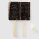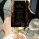 This elegant, modern wedding program fan features a mocha brown agate background trimmed with gold faux glitter. The text appears in elegant gold-coloured handwriting and copperplate fonts on a black rectangle.