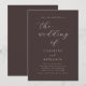 This wedding invitation features large flowing script reading "the wedding of" on a rich mocha brown background, with the couple's names in spaced capital letters and event details in a delicate typewriter-style font below. The cream-on-dark palette gives it a modern, moody elegance that works beautifully for fall or winter weddings.