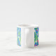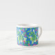 A pretty Espresso Mug with creamy white Mock Orange and bright pink Weigelia on a sky blue background from a handpainted design by Judy Adamson.