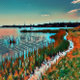 Modern Mix of bright fall colours line the coastline of this quiet bay. A coastal pathway follows the edge of the seaside. Perfect addition to your home or office decor.