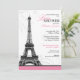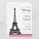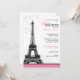 Pink Invitations: Elegant and modern Parisian Baby Shower invitations with a grey-scale Eiffel Tower atop a pink bottom border with light grey flourishes behind it.