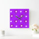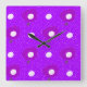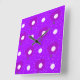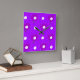 This purple mod square clock features purple circle design elements that resemble mod designs from the 1960s set on a lighter shade of purple background with white dots.