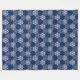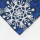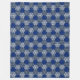 Fleece blanket with a large scale pattern of snowflakes in blue, grey and white.