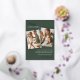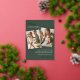 Stylish christmas card featuring a moss green background, 2 photos for you to replace with your own, real gold foil borders, the seasons greetings 'merry christmas', a personalised message, and your family name.