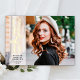 On the front, there's a full-bleed portrait with a fashionable modern GRAD real foil typography standing over a vertical sheer white overlay band, as well as the graduate's name and class year. The reverse of the card may be customised with a second photo, the names of the graduate's parents, and information about the graduation ceremony.