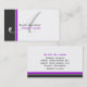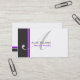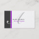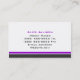 A white background with a large charcoal coloured stripe and a smaller purple coloured stripe on the left hand side of the card. In the centre of the card is a large initial in soft grey. Your name and title is on the front and all other information is on the back.