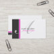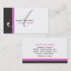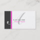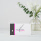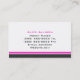 A white background with a large charcoal coloured stripe and a smaller hot pink coloured stripe on the left hand side of the card. In the centre of the card is a large initial in soft grey. Your name and title is on the front and all other information is on the back.