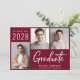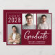 Modern burgundy red graduation announcement and party invitation featuring a 3 photo collage, "Graduate" in large white typography and the grad's class year, name and school or university in simple white typography. Add the party details on the reverse side.