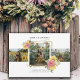 A unique modern graduation announcement featuring 3 photos of a woman in a field of sunflowers. Sunny and cheerful, with a gold frame with flowers and bees to elevate the photo style. Replace the sample photos with your own graduation photos. The back of the announcement features the phrase: onto the next chapter". You may keep the phrase or delete it.