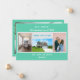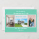 Minimalist, elegant, trendy moving announcement card with 3+1 custom photos, the names of family members, and the text "We've Moved! Come visit us soon!" + the new address and landline phone number on the front for you to personalise. Modern, chic aquamarine teal background with white, blue, and teal writing.