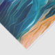 They are represented by flowing, layered patterns. It features a palette primarily consisting of deep blues and vibrant teals, with hints of luminous white. The bottom portion introduces contrasting warm sandy shore hues, including soft yellows and ochres, which gradually blend into the water. The piece draws viewers into an immersive experience, suggesting elements of both natural landscapes and abstract surf forms.