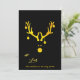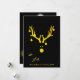 A funny and cute modern abstract image of a reindeer head in faux gold. With Christmas ornaments, baubles hanging from the antlers. Classic black background,
