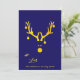 A funny and cute modern abstract image of a reindeer head in faux gold. With Christmas ornaments, baubles hanging from the antlers. Classic blue background,