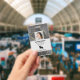 Company employee identification badge with templates created for you. Background is a modern abstract in silver grey.