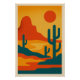 Minimalist and burning with visual warmth, this desert landscape plays with warm color dishes and clean lines. Geometric cactus, perfect circular sun and rounded hills form a modern and graphic scene. An ideal room for contemporary interiors and lovers of retro chic design.