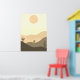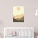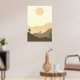 Modern abstract desert scene in neutral tones of peach, brown and taupe, features sun, hills and cacti silhouettes
