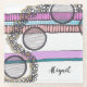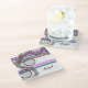 This pretty and modern coaster can be personalised with your name. It has an unusual abstract watercolour and pen design of stripes and circles on a white background. There are pink, apricot and blue stripes broken by a doodle style pattern of flowing circles in black and grey, with gold highlights. The artwork is original, and only available from The Art of Being Beth.