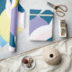 Elevate your gift-giving with this modern wrapping paper featuring a striking, overlapping abstract crescent and arc pattern. The dynamic composition utilises a bold colour palette of deep teal, lavender, lime green, and pale blue set against contrasting cream and white elements. Perfect for making any gift stand out, this versatile and sophisticated design is ideal for birthdays, holidays, and contemporary events.