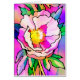 Card featuring a modern design of pink peony on a colourful background in pink, blue and purple.