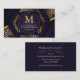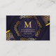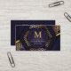 Modern abstract dark purple with gold metallic wire mesh design. Lighter purple clock background in centre with monogram, name and proposition value templates on front. On back: Company name, email address, business location, and website templates on dark purple background.