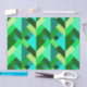 Tissue paper in a Mid-Century Modern design of layered triangles in shades of deep emerald green, lime, aqua, teal, and turquoise